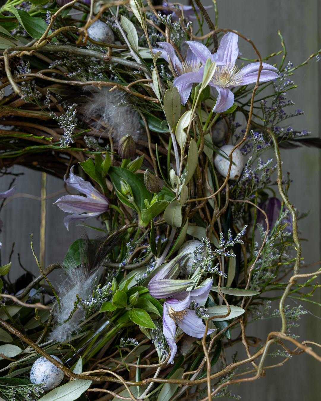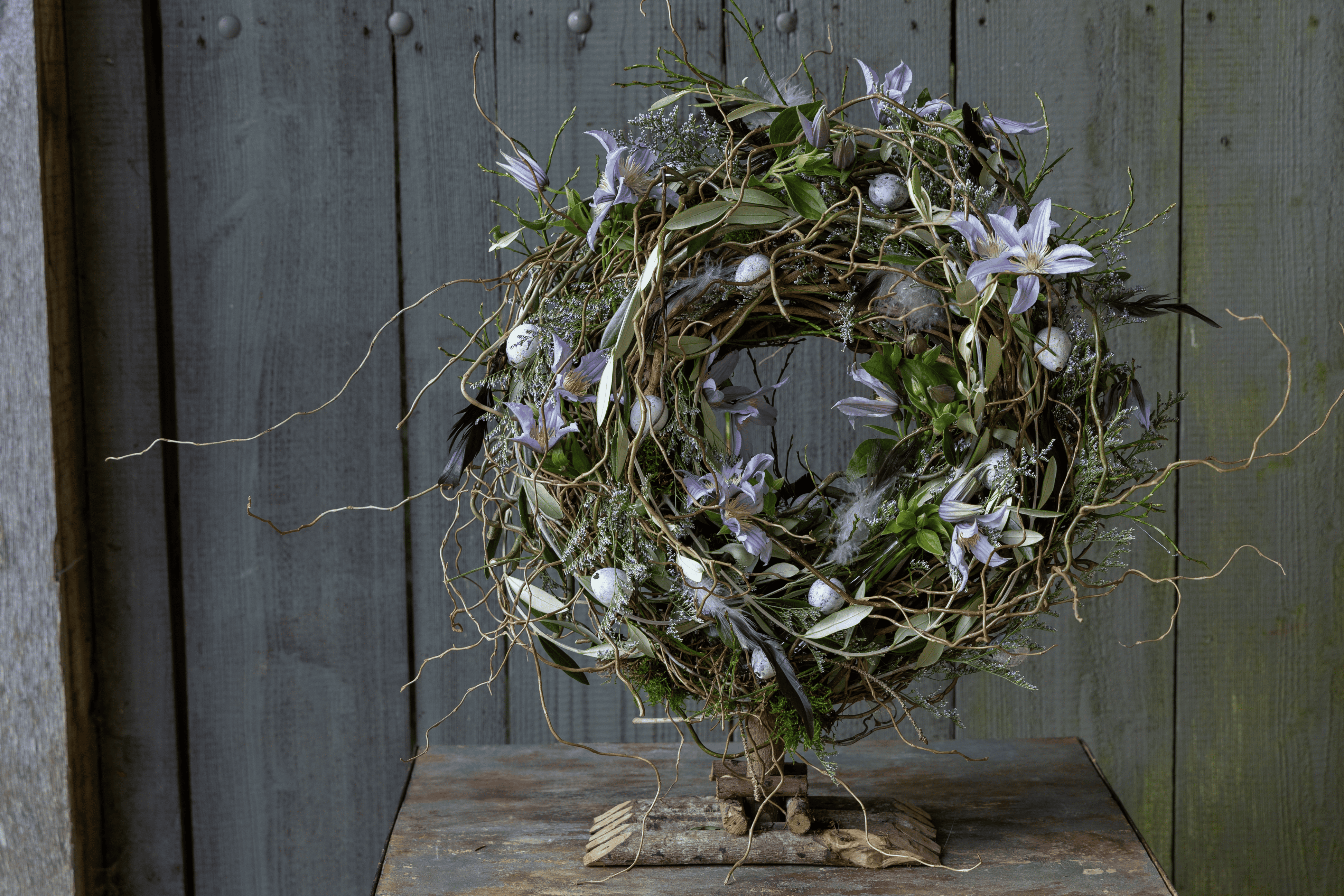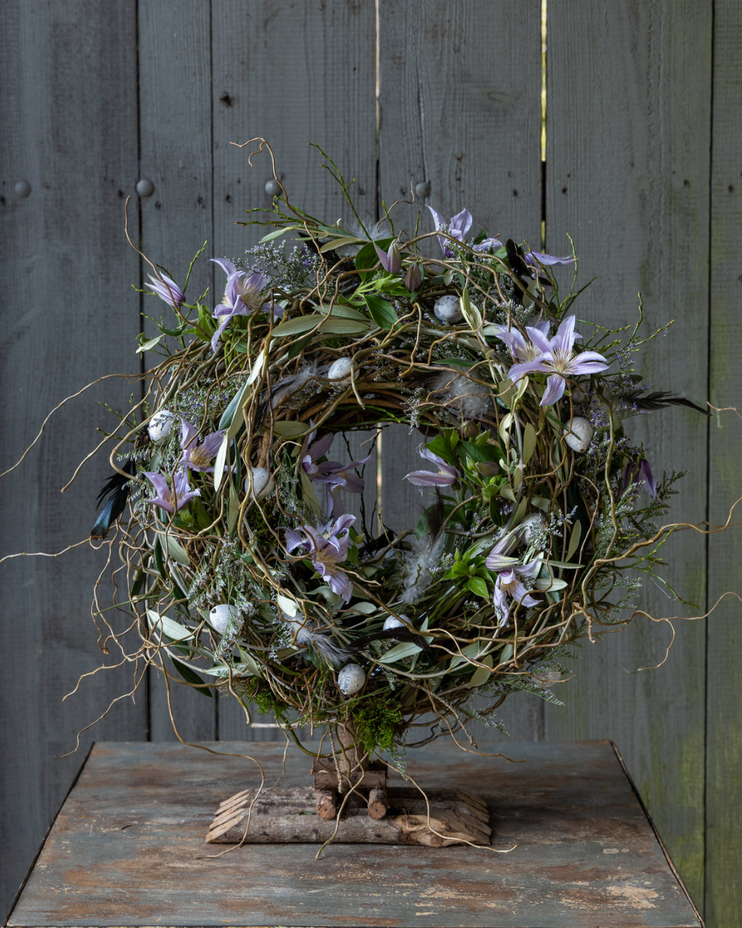 Een sierlijke krans van allerei wilde takken op een houten voet. Versierd met eitjes, veren en bloemen. De bloemen blijven vers door de kleine vaasjes die in de krans verstopt zijn. Een prachtige decoratie om de prille voorjaarssfeer mee in huis te brengen.