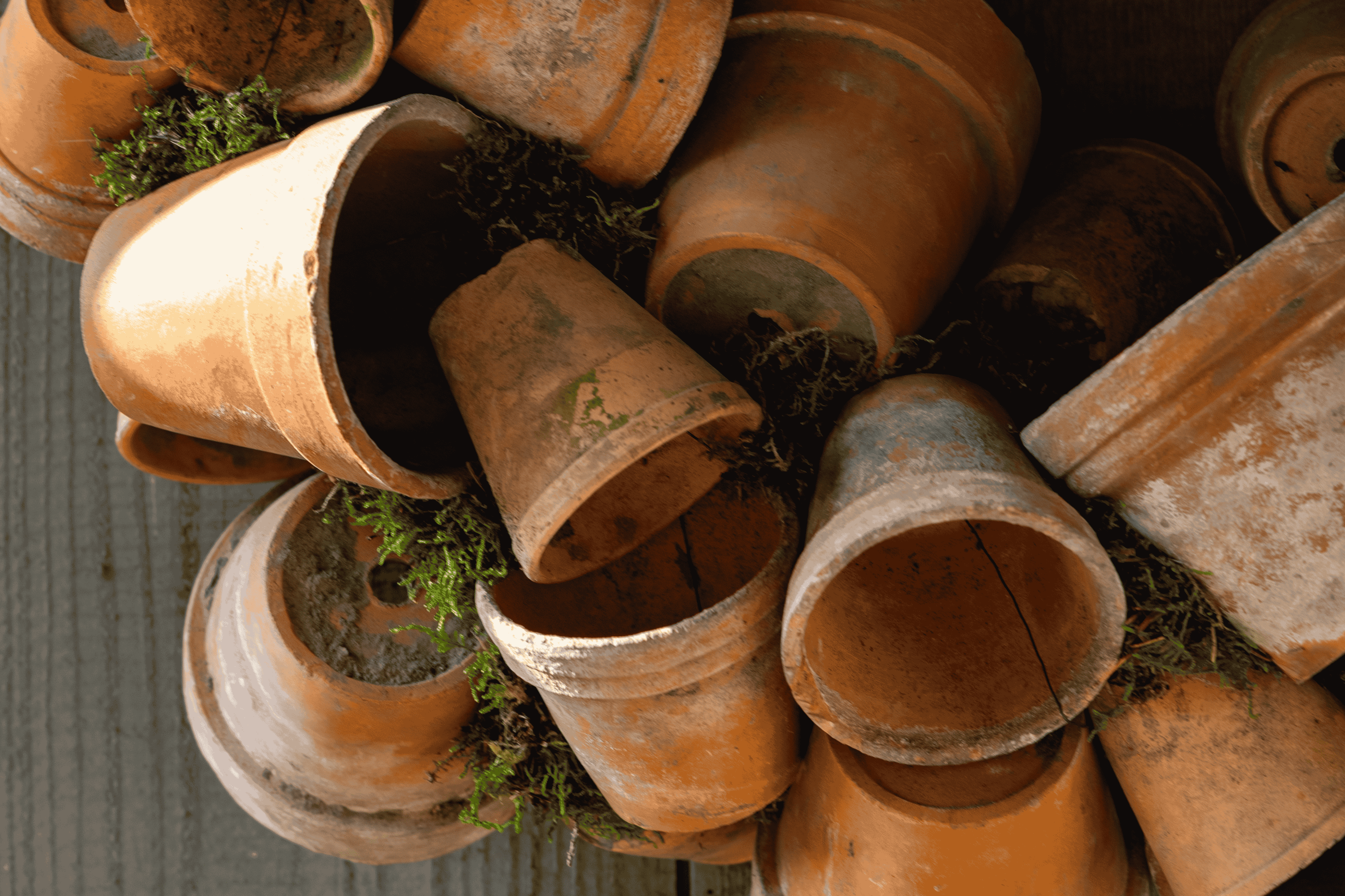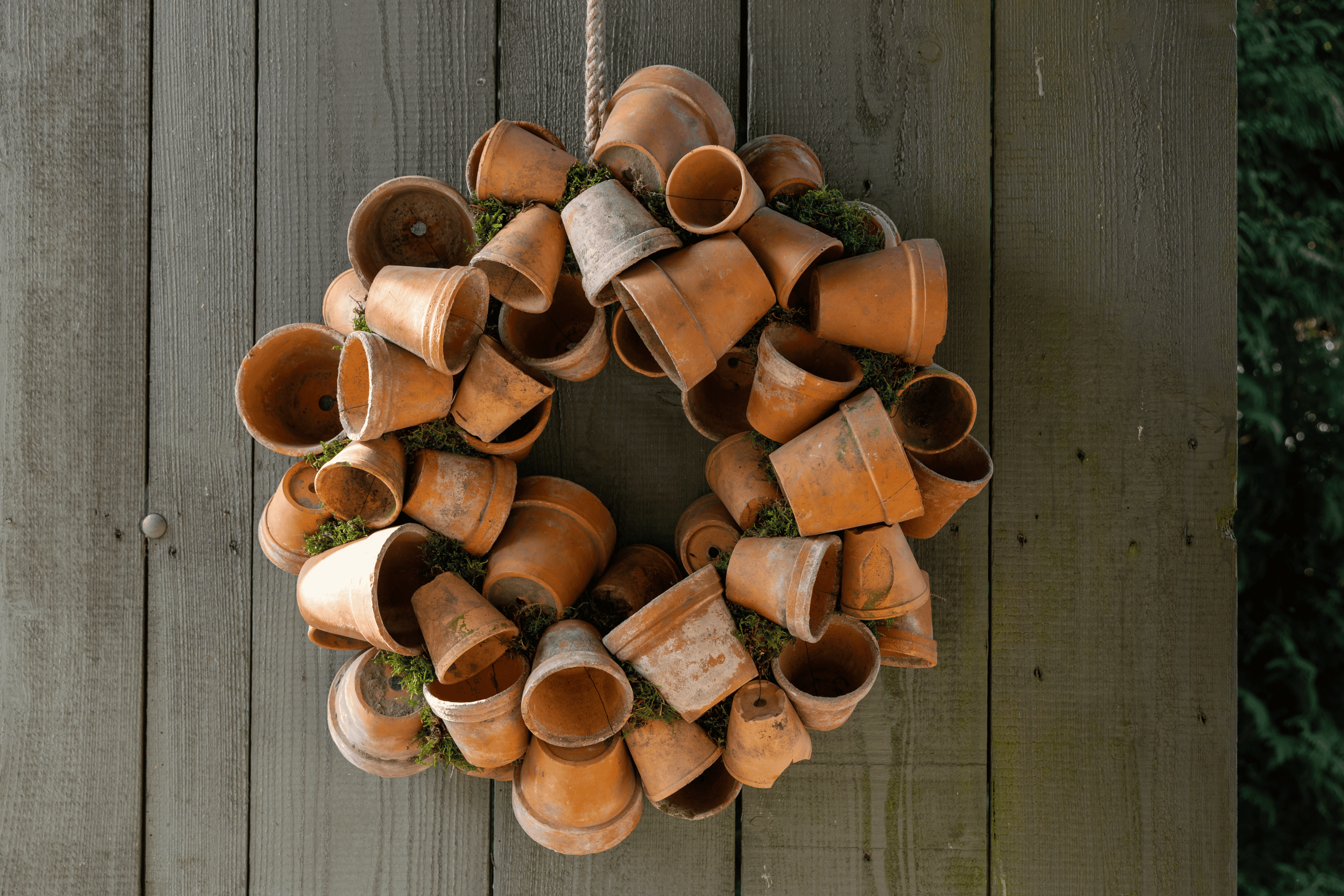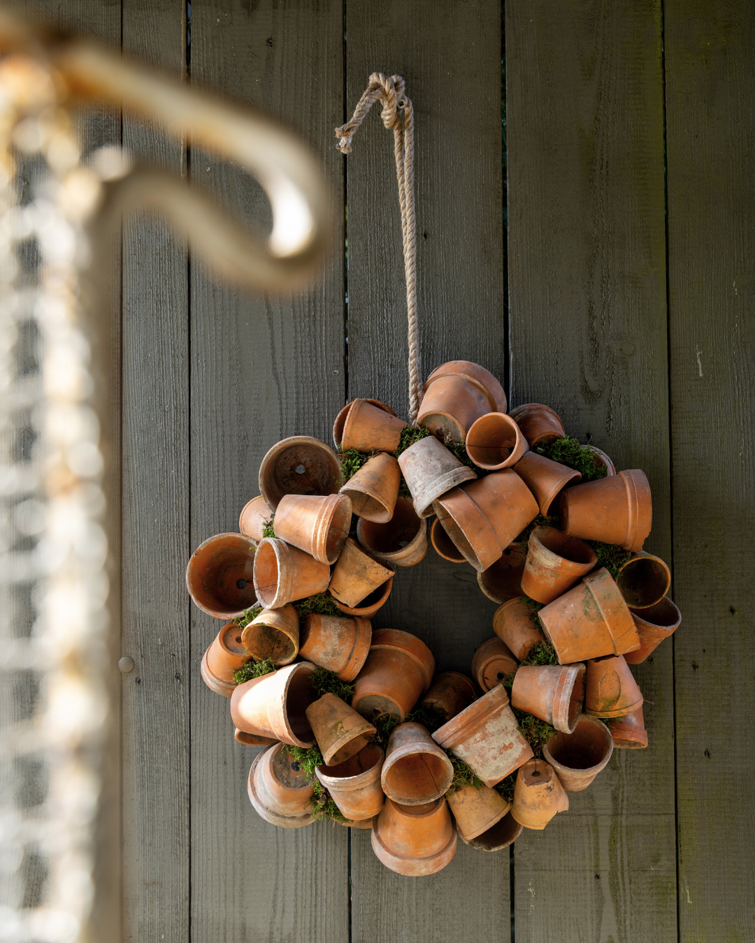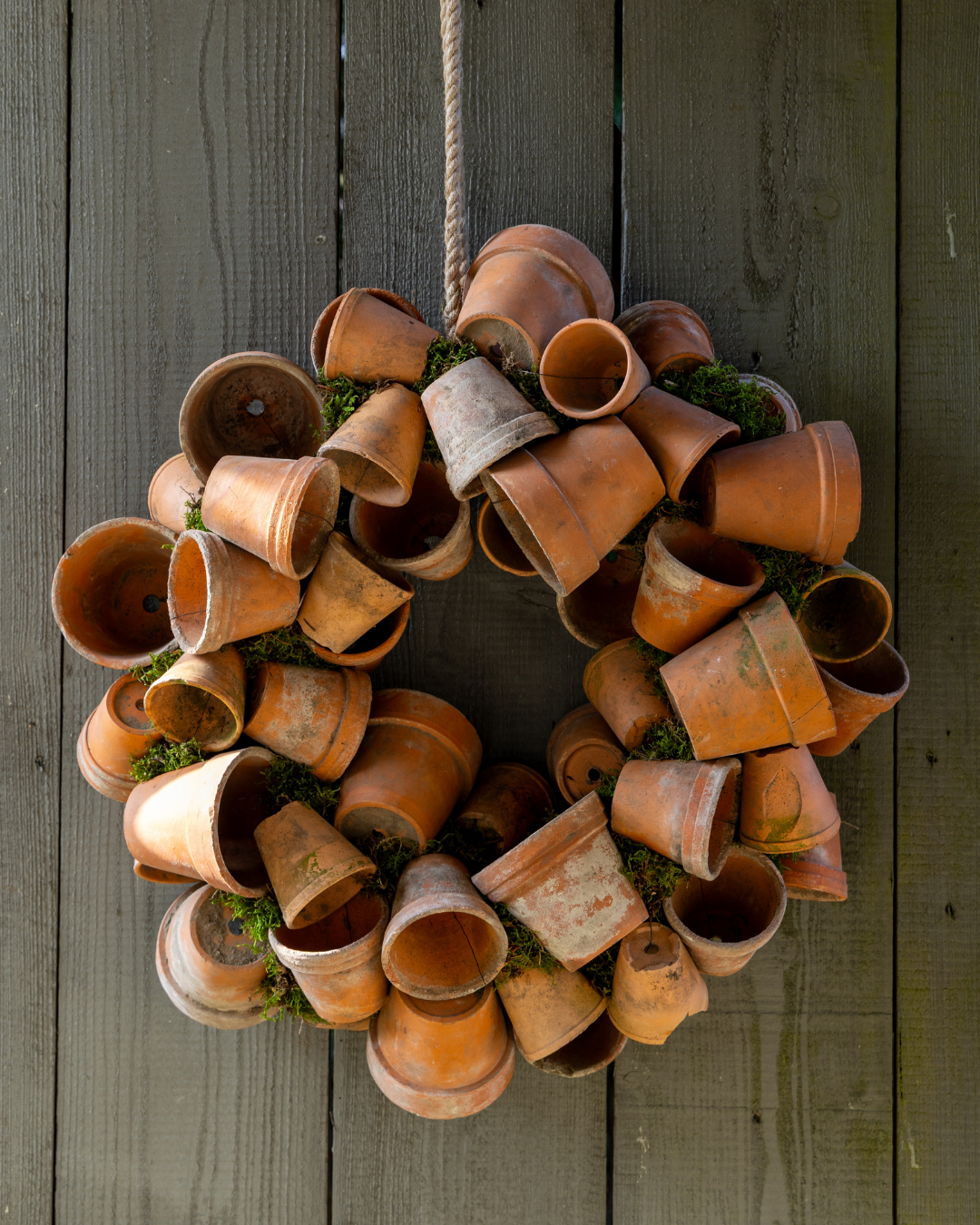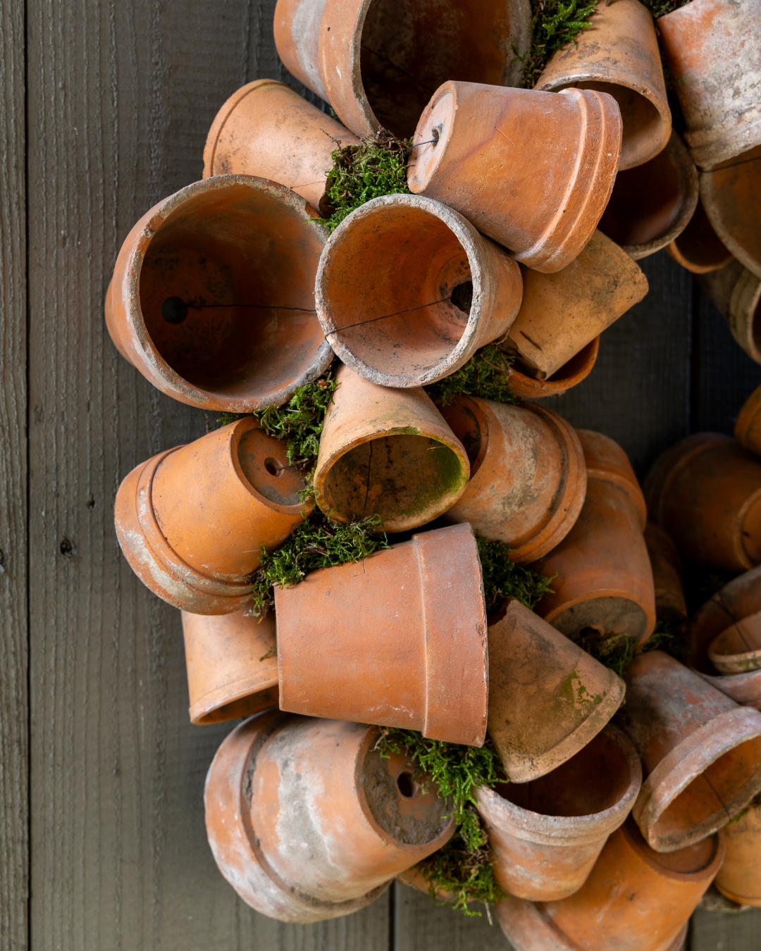 Een grote, robuuste krans van oude terracotta potjes en mos. Van deze krans kun je het hele tuinseizoen genieten!