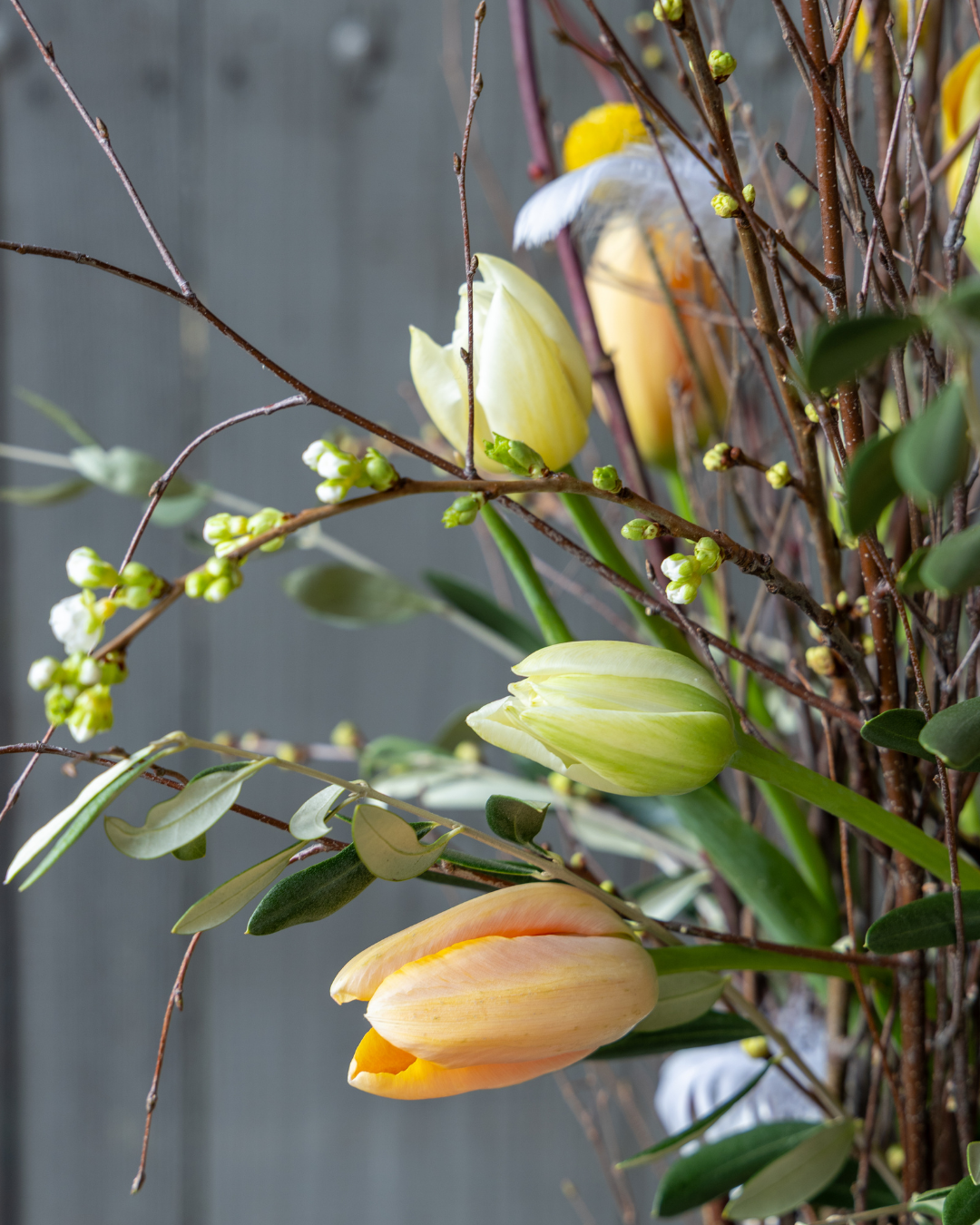 Een elegante bundel van Franse tulpen en sierlijke takken geïnspireerd op de prille natuur van het voorjaar. Deze hoge bundel is een echte eyecatcher voor je interieur!