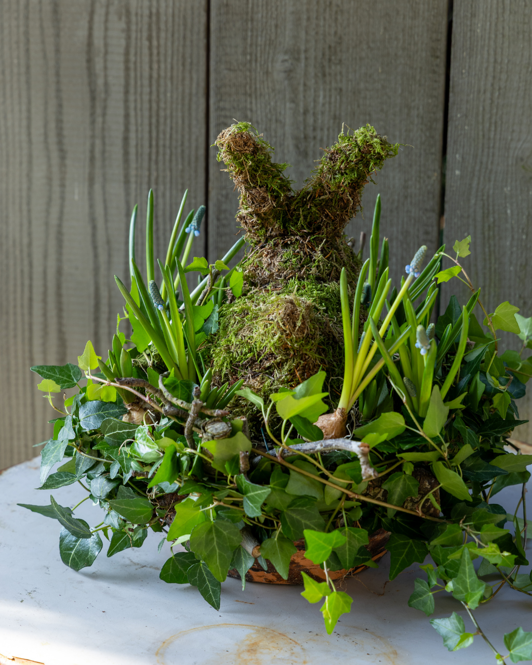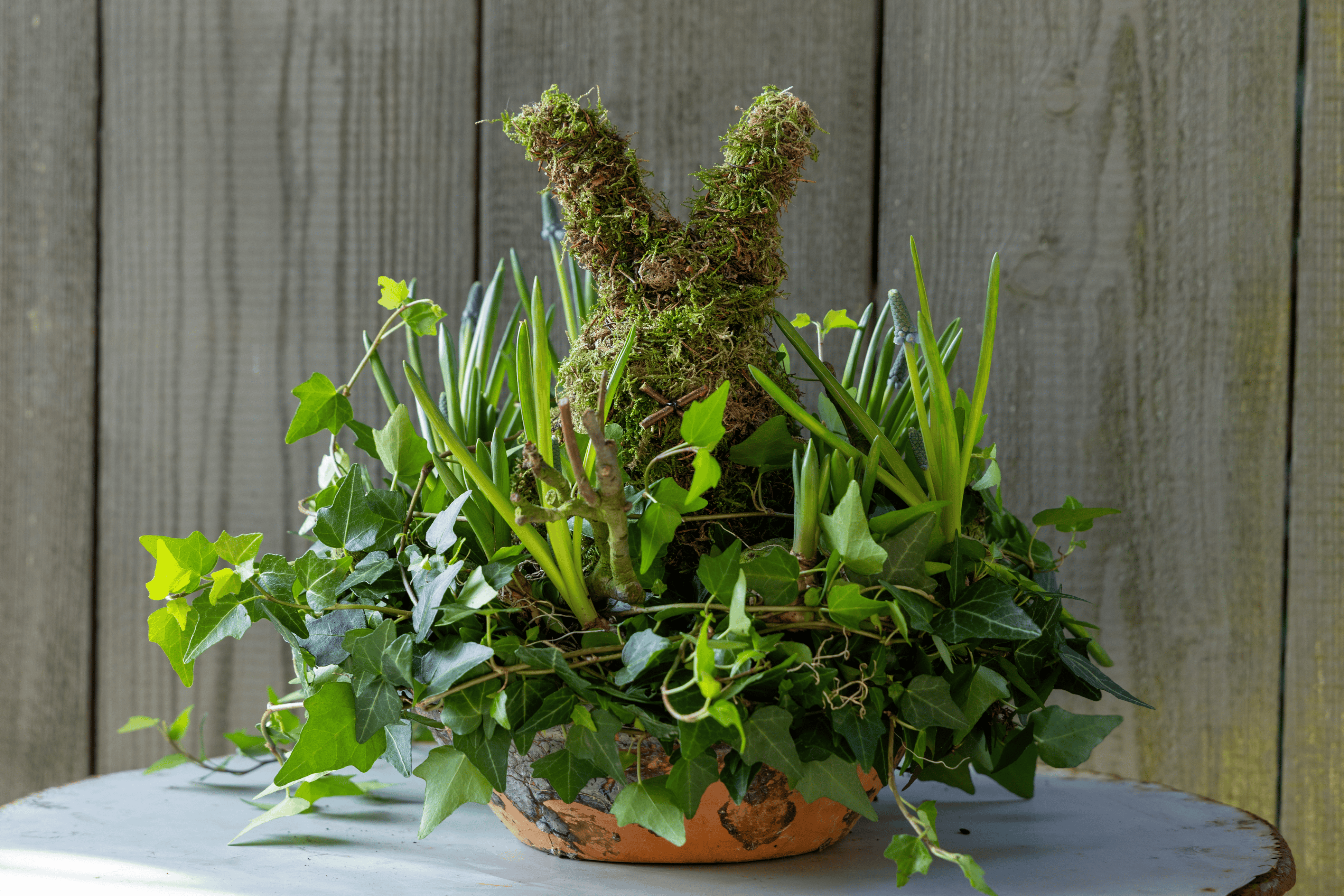 Een moskonijntje in een potje gevuld met frisse groene bladeren en kleurrijke bolletjes. Een decoratie waar je vrolijk van wordt!