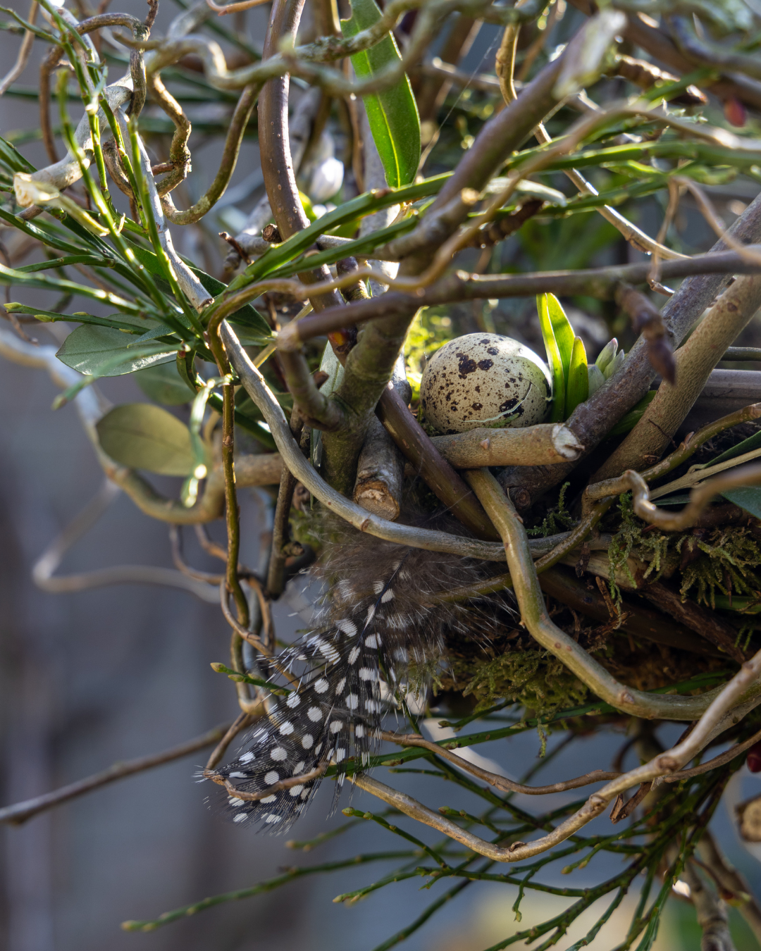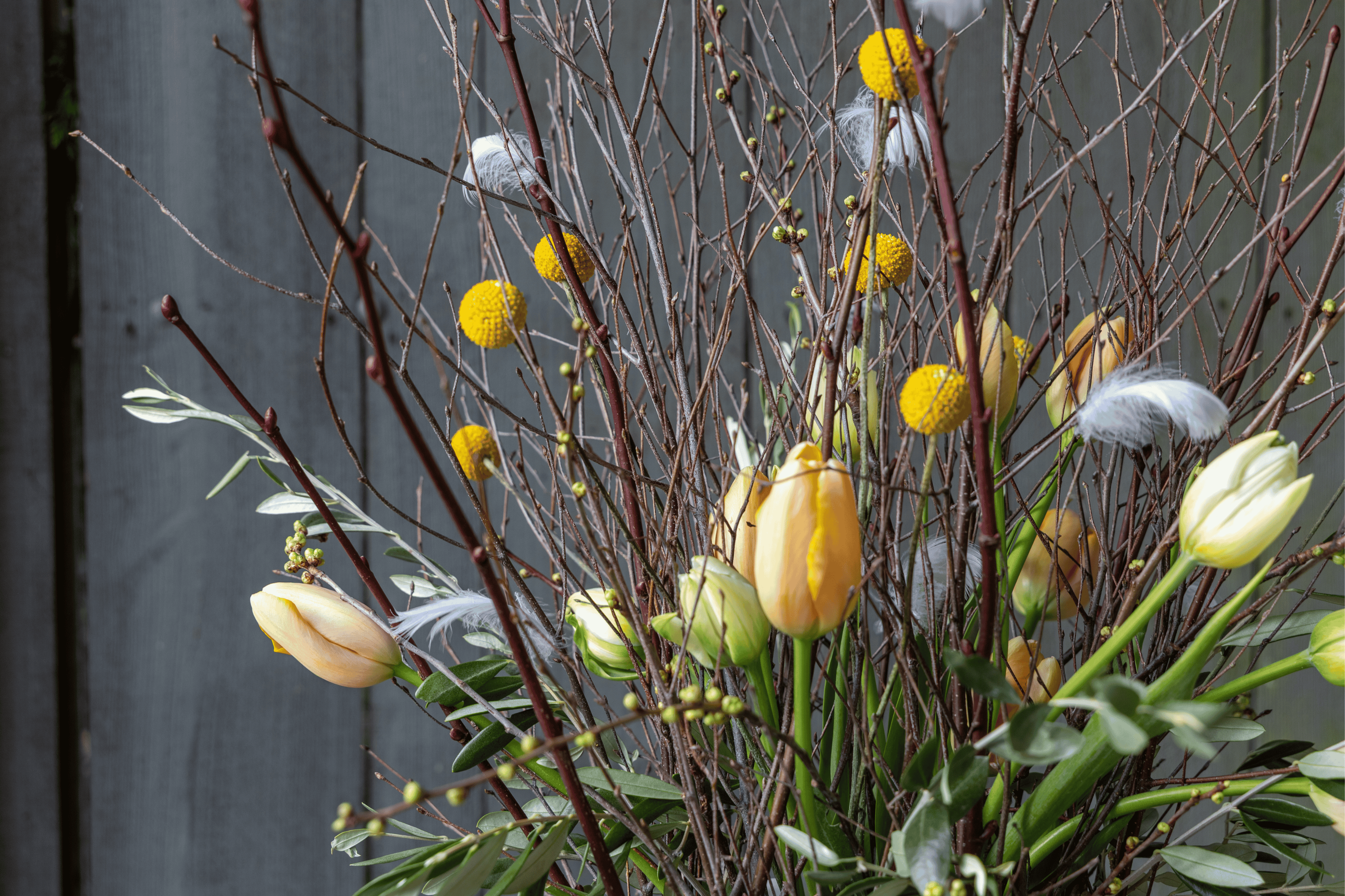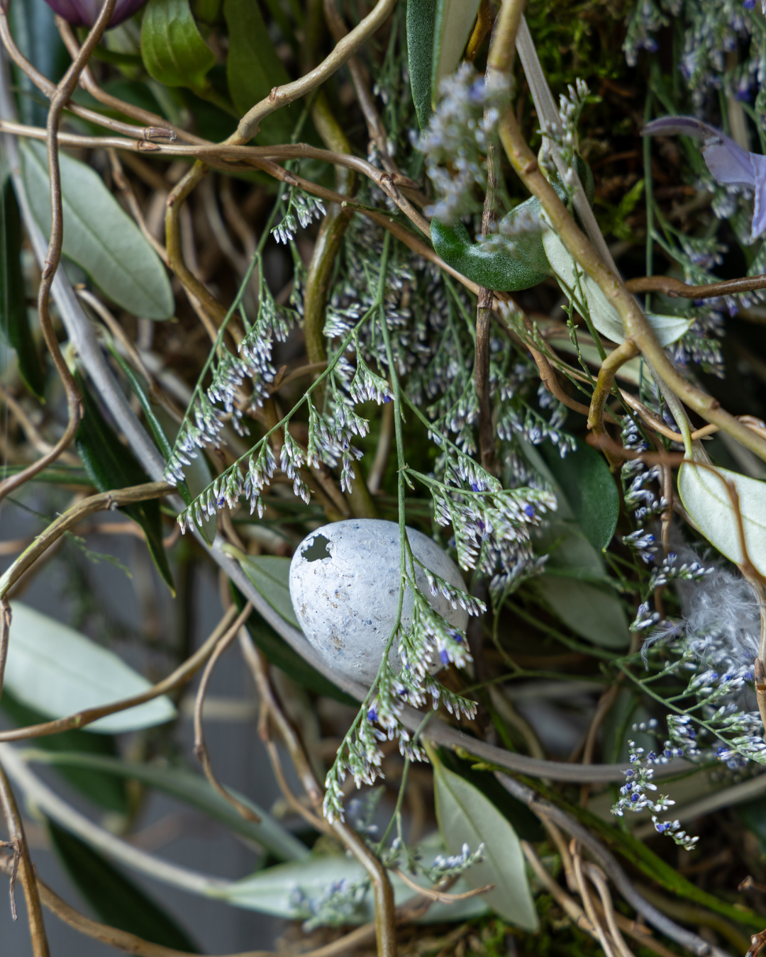 Kronkelende takken, grillig hout, veren, eieren en bladeren. Het is net alsof een vogel een wild voorjaarsnest heeft gebouwd. Deze speelse decoratie komt helemaal tot leven zodra de narcissen beginnen te bloeien.