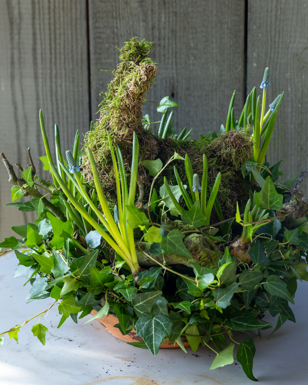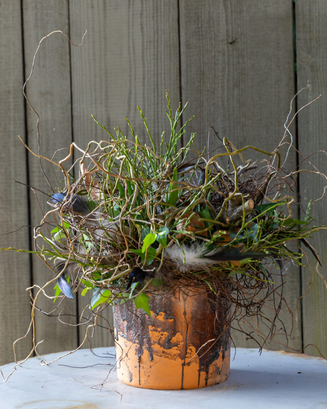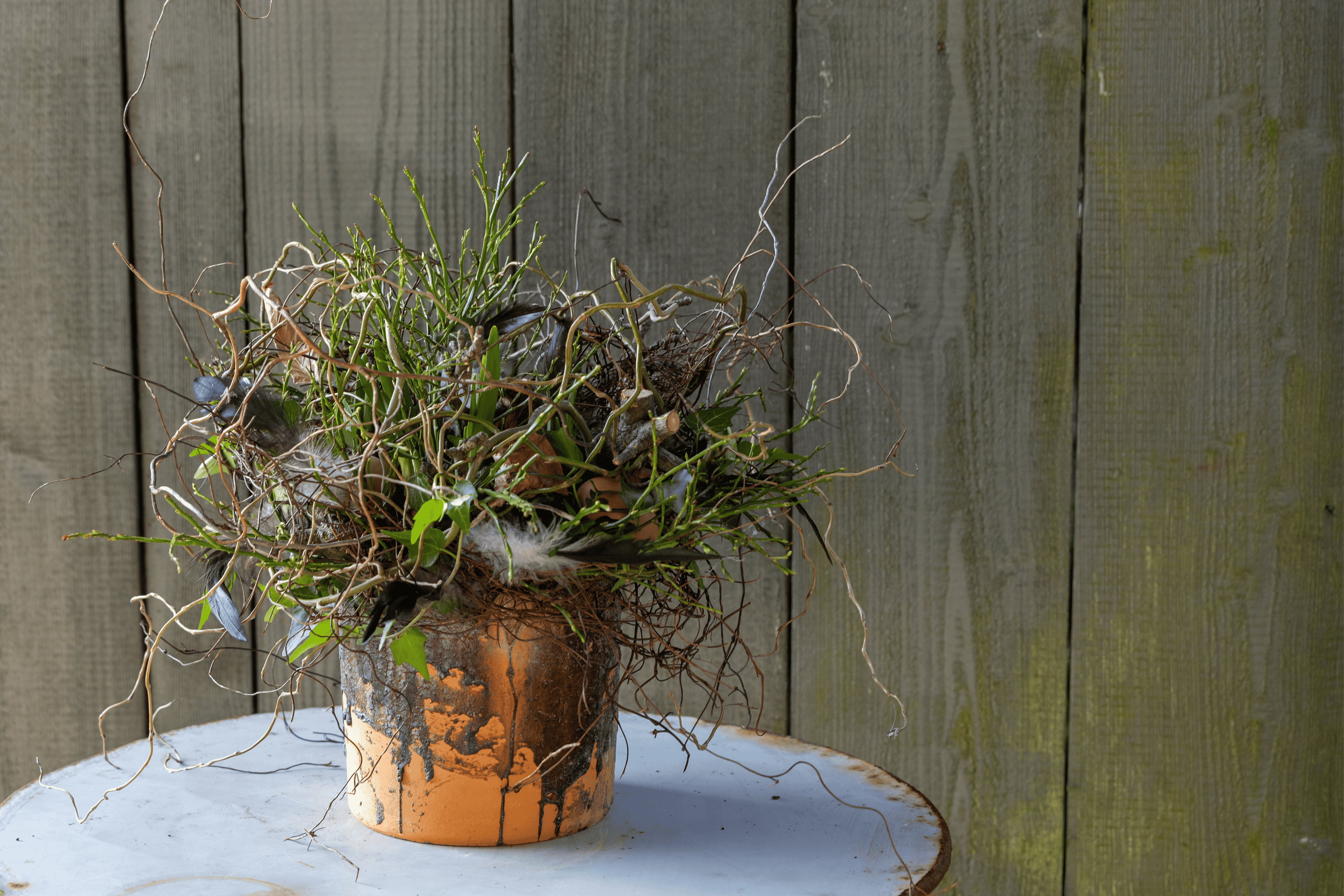 Kronkelende takken, grillig hout, veren, eieren en bladeren. Het is net alsof een vogel een wild voorjaarsnest heeft gebouwd. Deze speelse decoratie komt helemaal tot leven zodra de narcissen beginnen te bloeien.