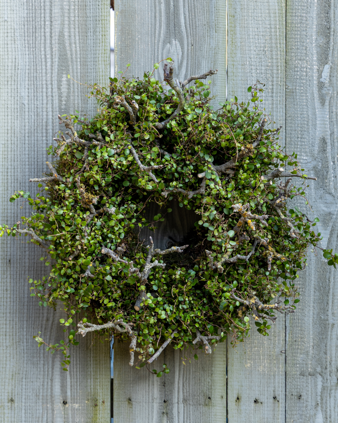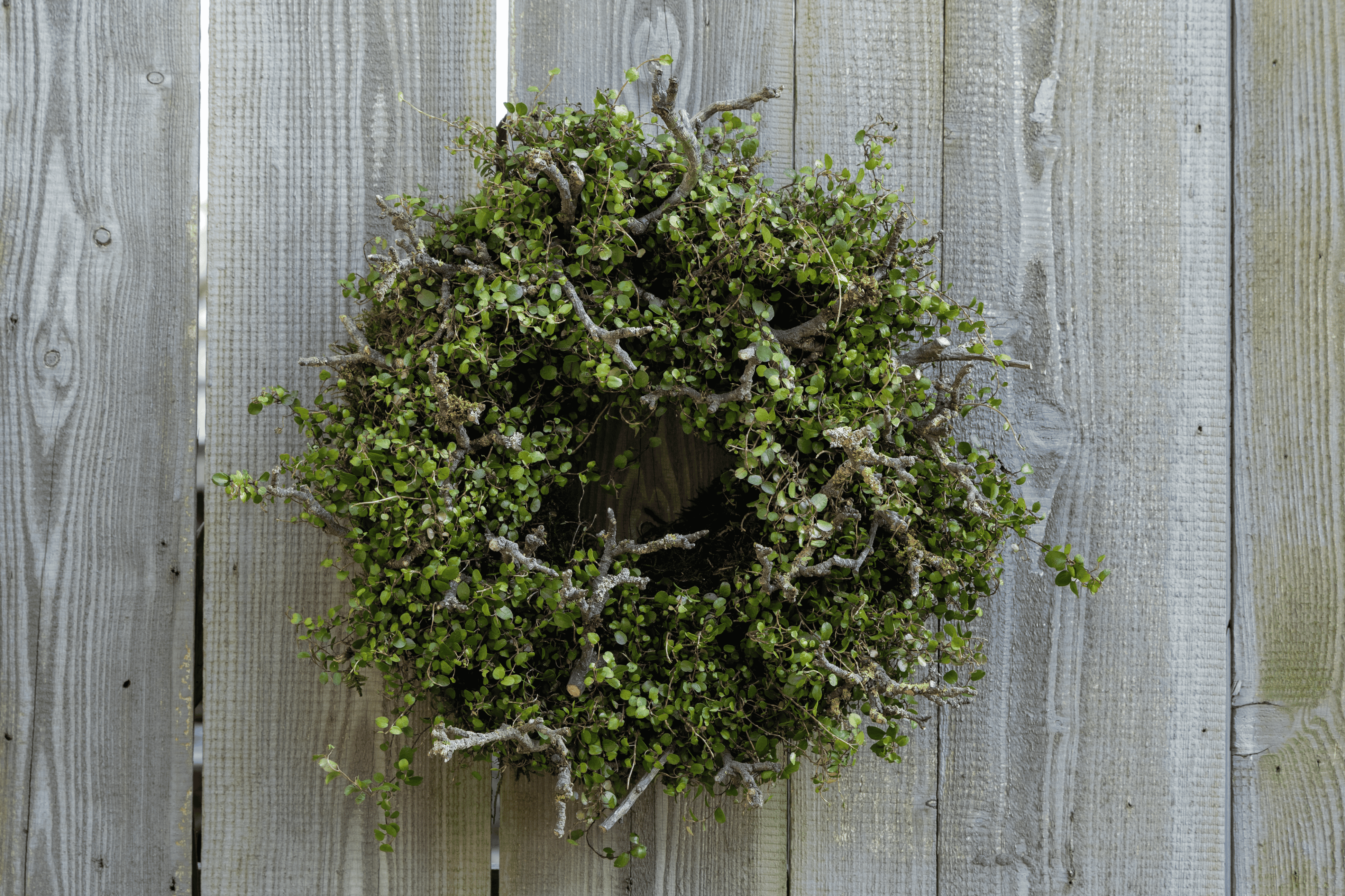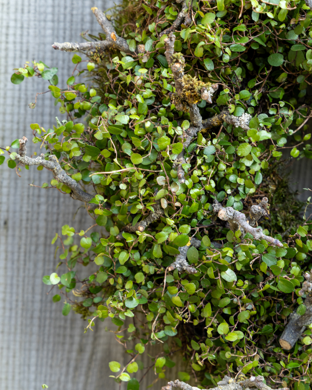 Een sobere, maar levendige krans van Wolkje der Liefde (Muehlenbeckia) planten. De kleine, verfijnde blaadjes contrasteren prachtig met het grillige hout.