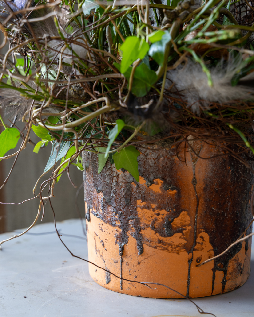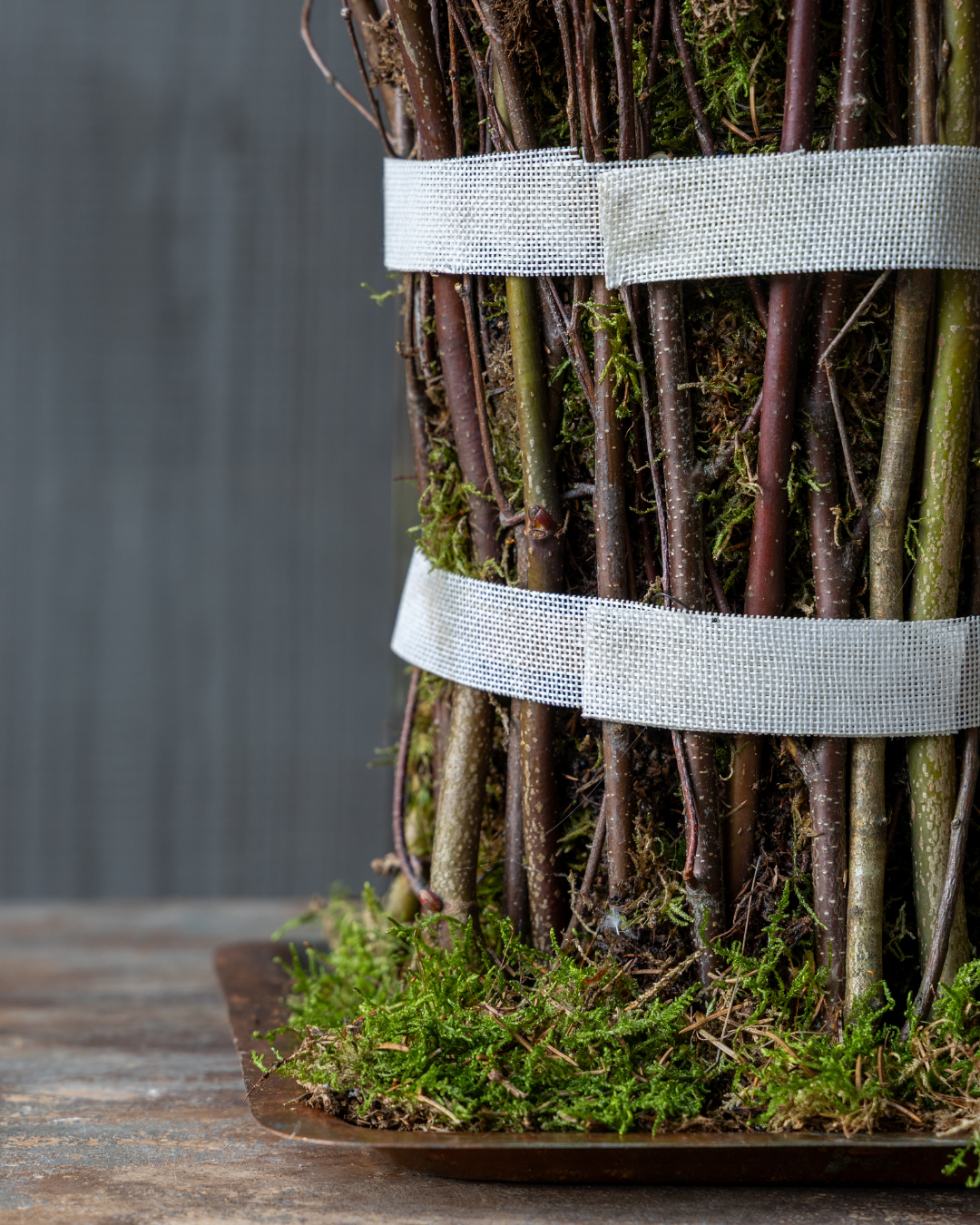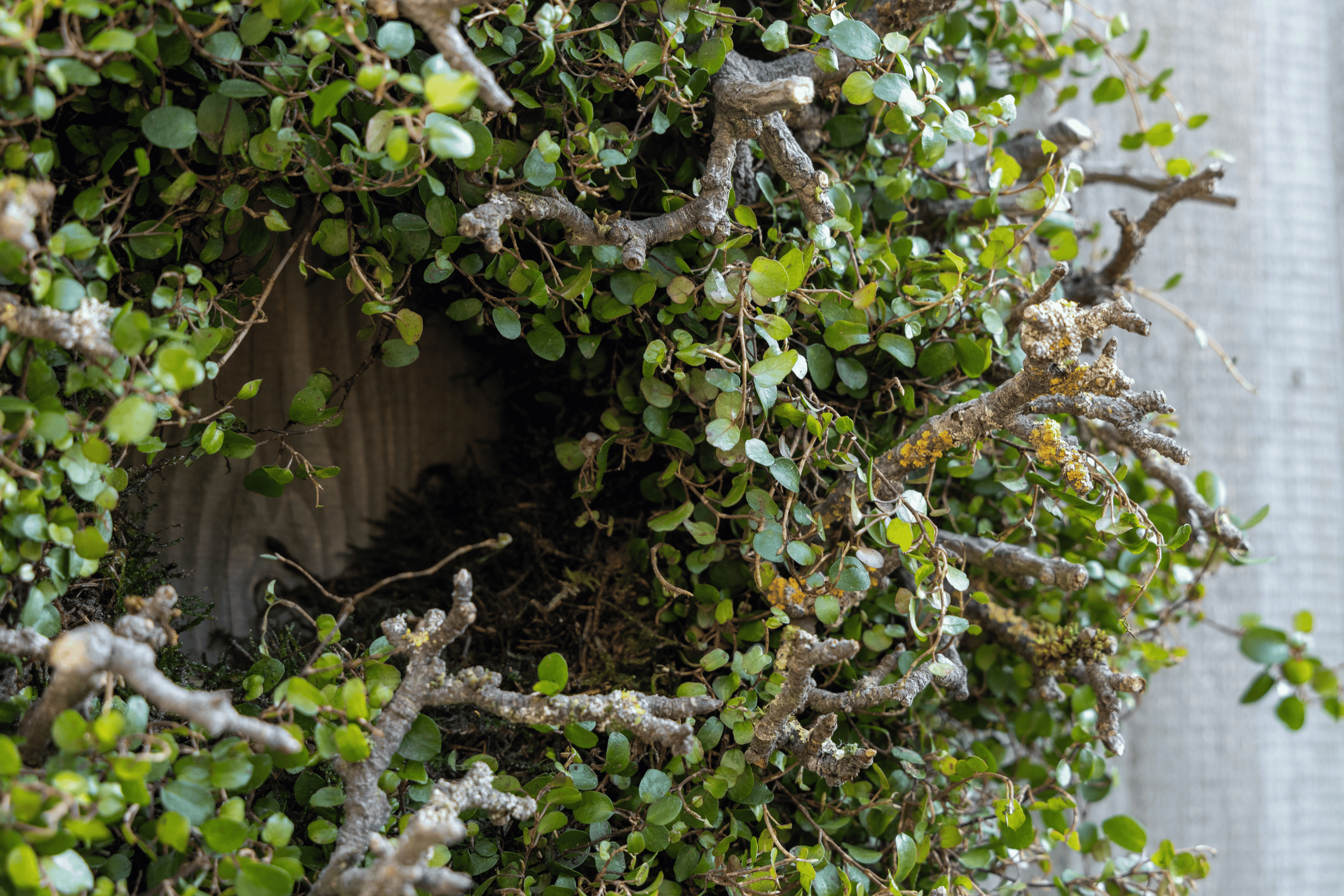 Een sobere, maar levendige krans van Wolkje der Liefde (Muehlenbeckia) planten. De kleine, verfijnde blaadjes contrasteren prachtig met het grillige hout.