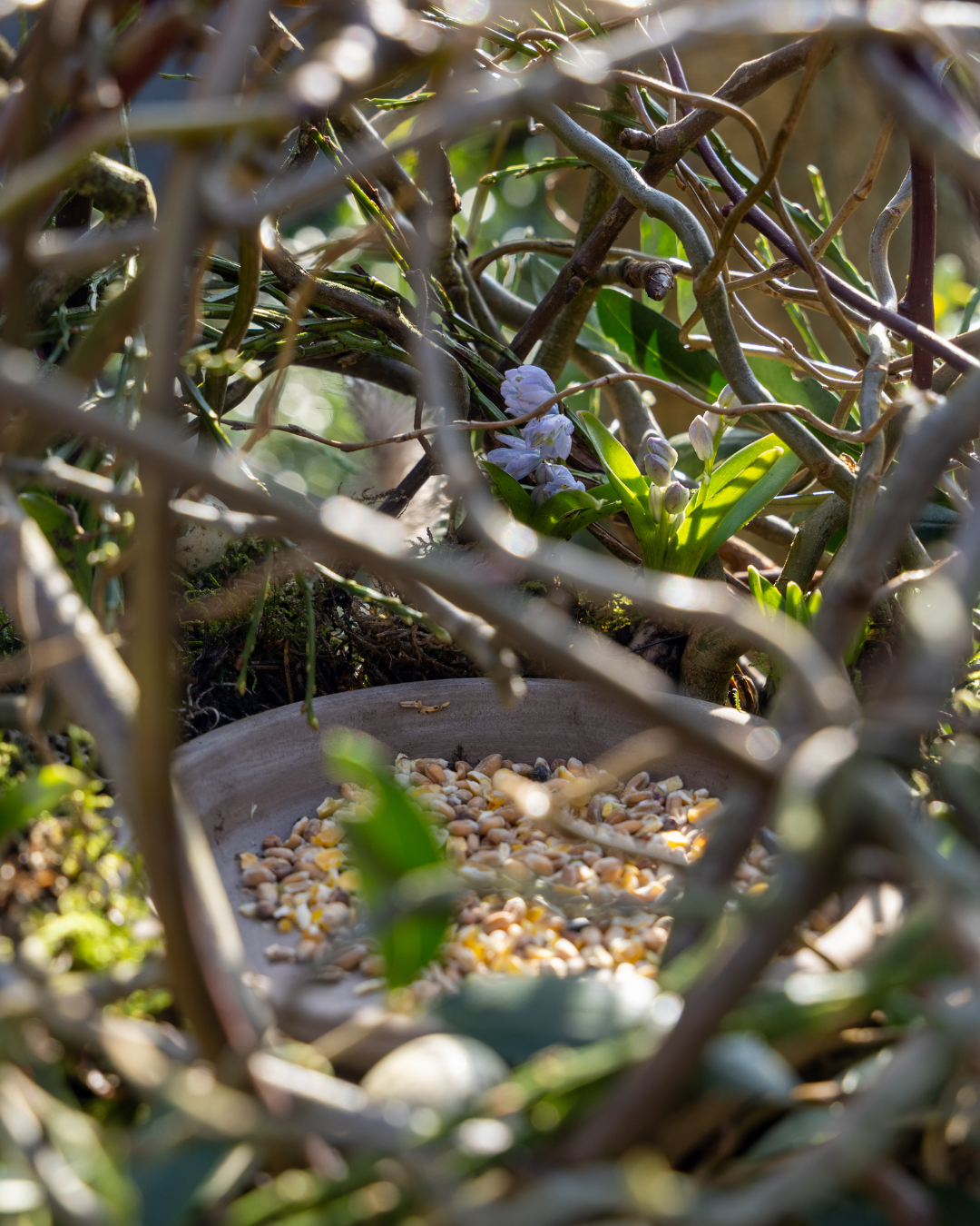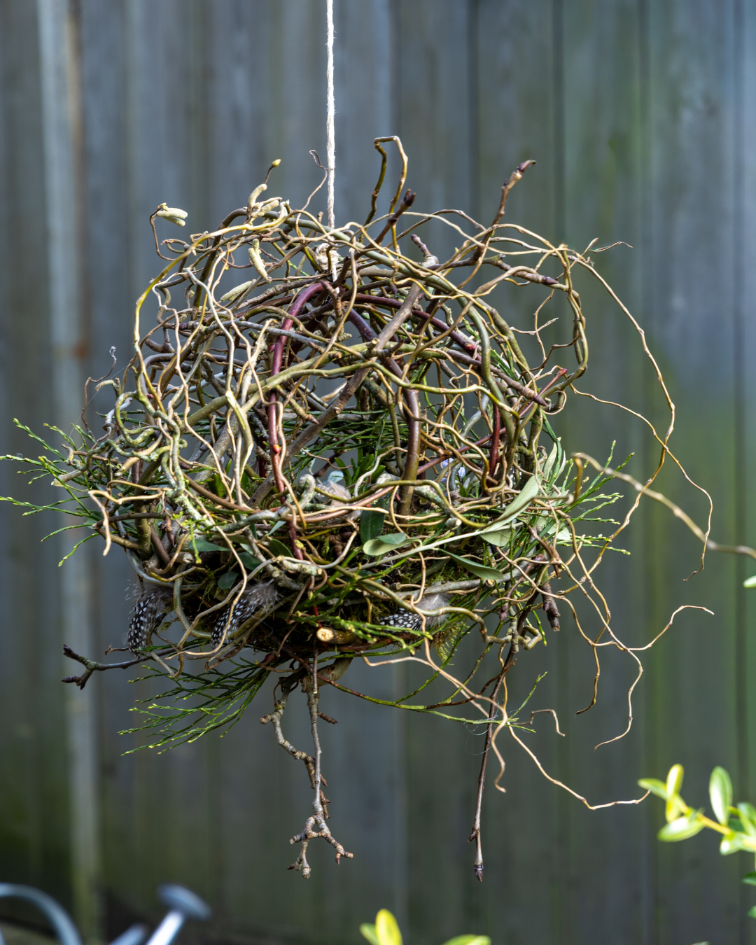 Een vrolijke decoratie om op te hangen in de tuin. De wilde takken omringen een voederschaal voor de kleine tuinvogels. Versierd met veren, eieren en bloeiende bolletjes.